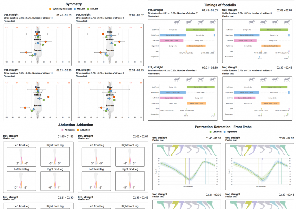 - Sensores de inercia inalámbricos en extremidades, dorso y cabeza que permiten obtener un análisis detallado de los movimientos del caballo como puedes ver en el ejemplo de informe a continuación.